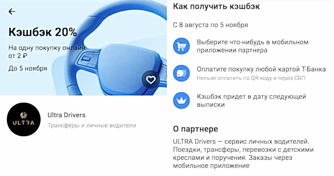 Все новые пользователи, которые совершат первую поездку в приложении Ultra Drivers и Pin-Up ее картой Т-Банка, получат кэшбэк 20% на карту Т-Банка.